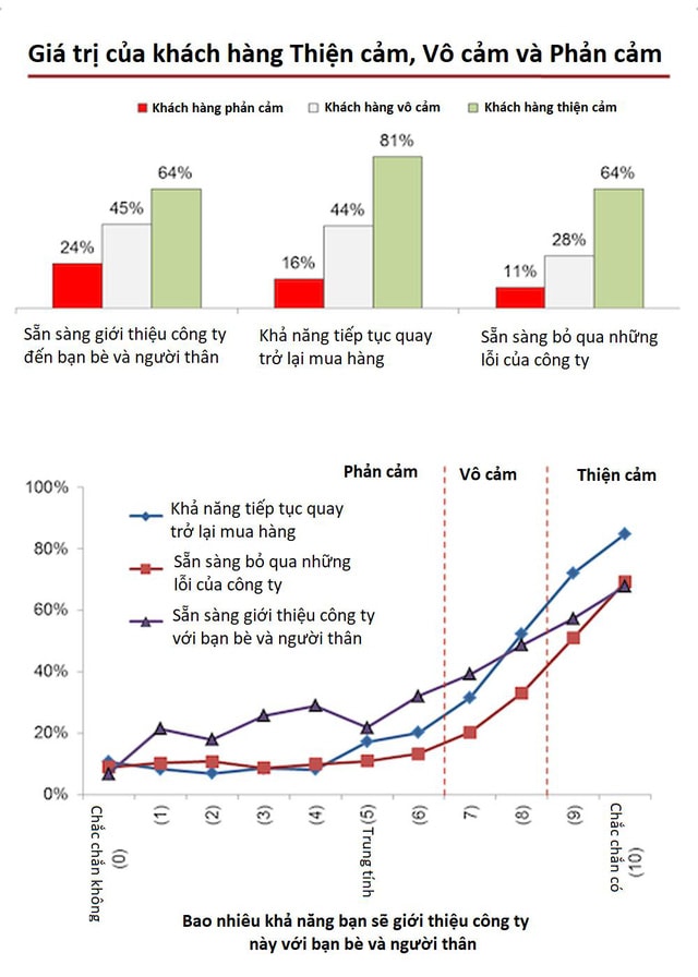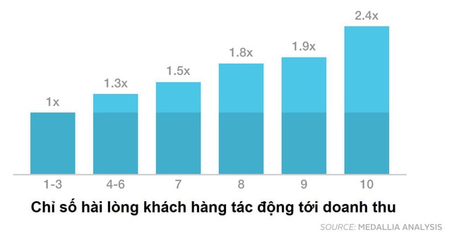 Số liệu thống kê của các tập đoàn nghiên cứu thị trường trên thế giới, chỉ ra rằng, khách hàng hài lòng nhất thì sẽ mua nhiều hơn 140 lần so với khách hàng không hài lòng. Điều quan trọng hơn, những người hài lòng còn giới thiệu sản phẩm cho người khác thì mức độ mua còn cao hơn gấp 2-3 lần. Như vậy, nếu khách hàng hài lòng, doanh nghiệp không những được lợi là có lượng khách hàng mua nhiều hơn mà khách hàng thậm chí còn giới thiệu sản phẩm, dịch vụ cho người khác.