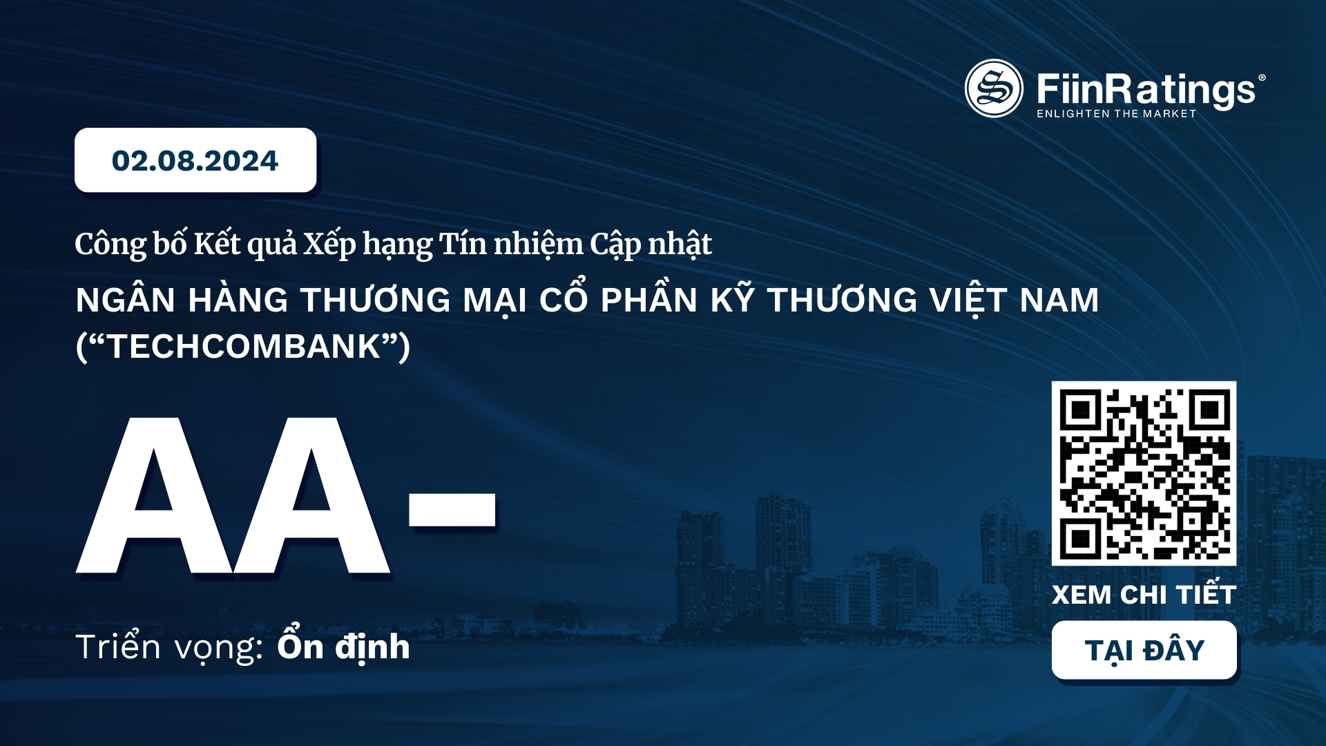FiinRatings thông báo nâng bậc Xếp hạng Tín nhiệm (‘XHTN’) nhà phát hành của Techcombank lên mức ‘AA-’ / triển vọng ‘ổn định’ dựa trên việc cải thiện về Nguồn vốn và Thanh khoản.