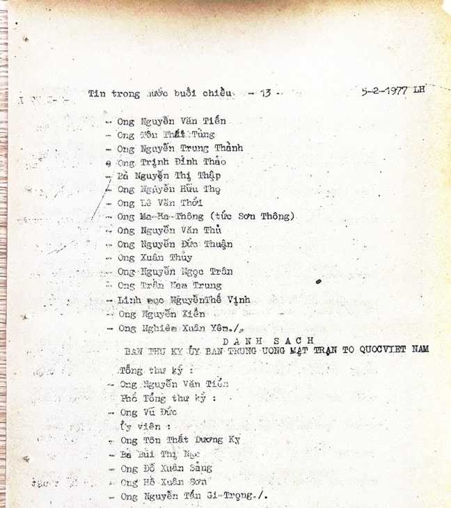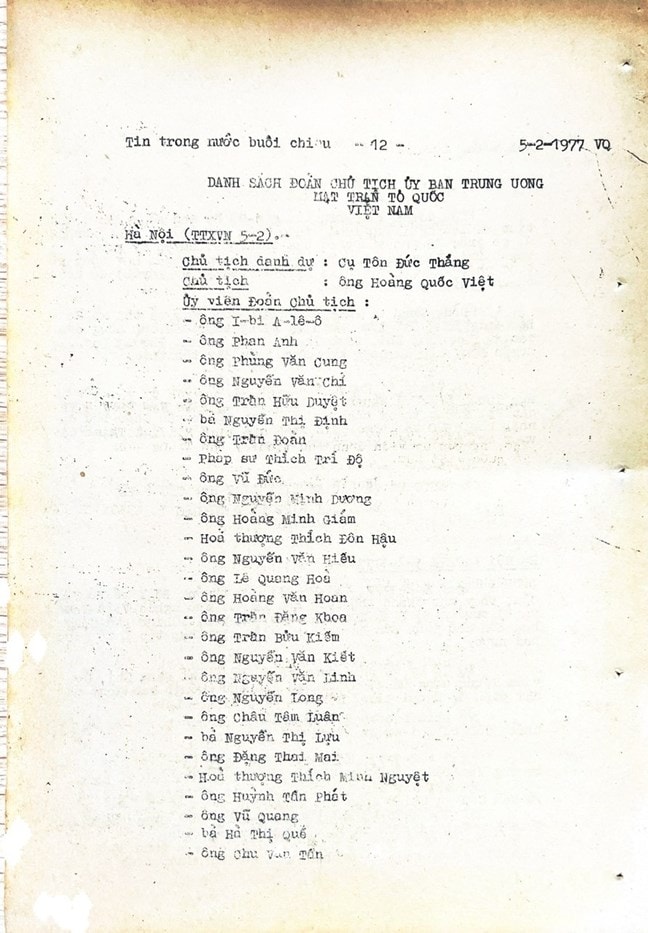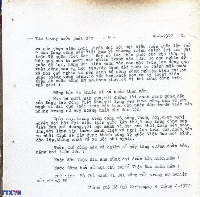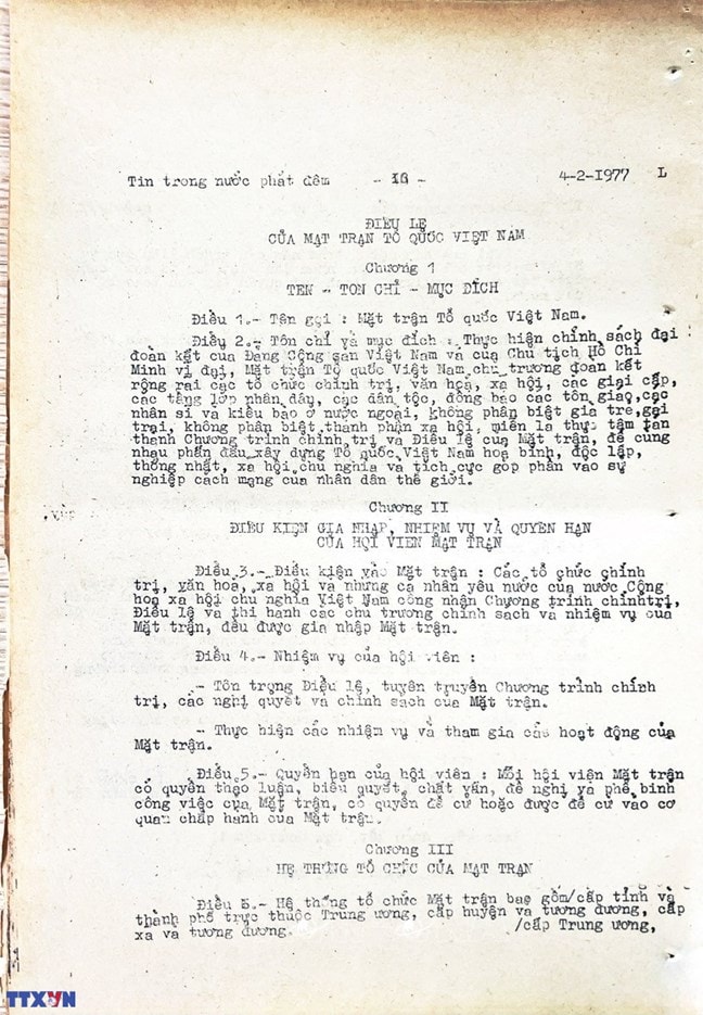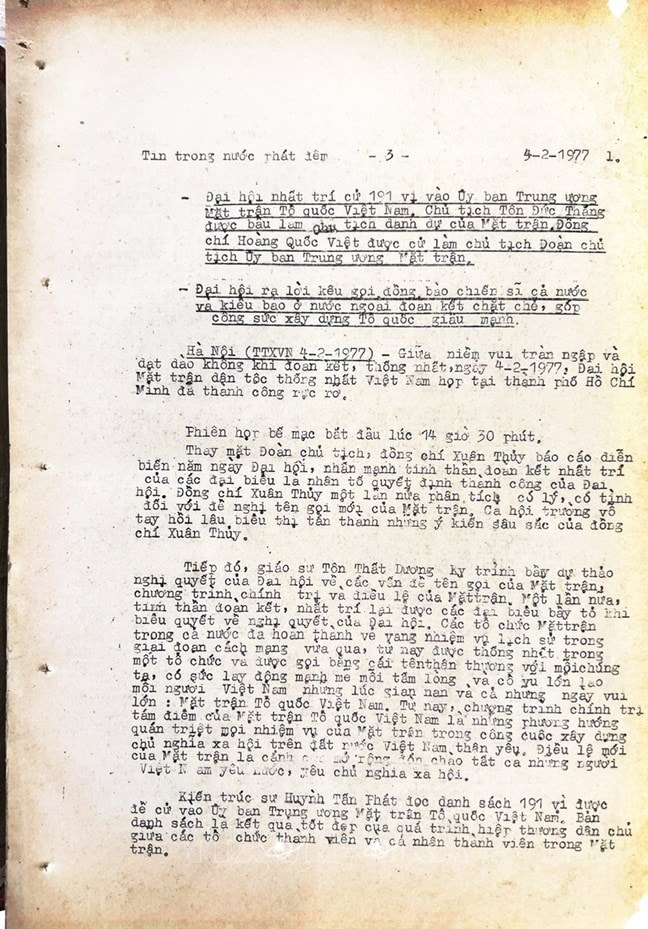 * Bài viết của Thông tấn xã Việt Nam (số 031-TTX), ngày 31/01/1977 về phiên khai mạc trọng thể Đại hội MTTQ Việt Nam lần thứ nhất