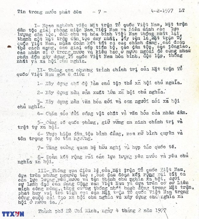 Đại hội Mặt trận dân tộc thống nhất Việt Nam họp từ ngày 31/1 đến 4/2/1977 tại Hội trường Thống nhất, TP Hồ Chí Minh, hợp nhất 3 tổ chức.