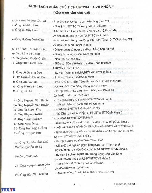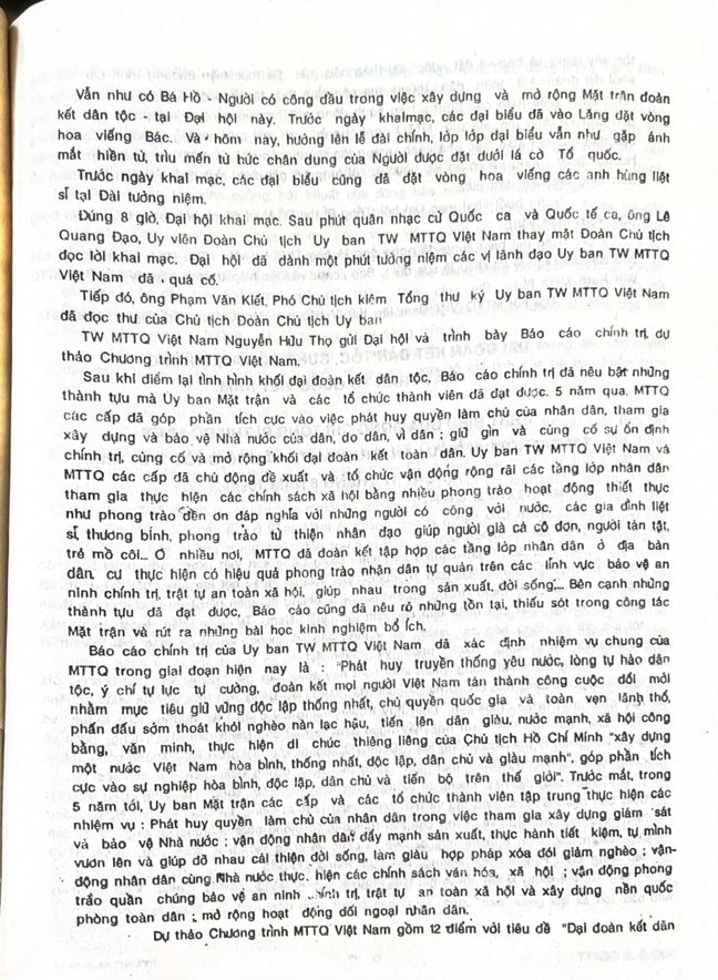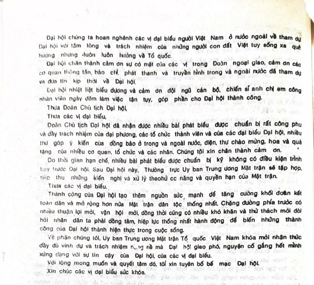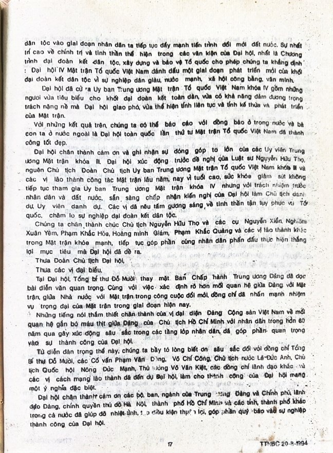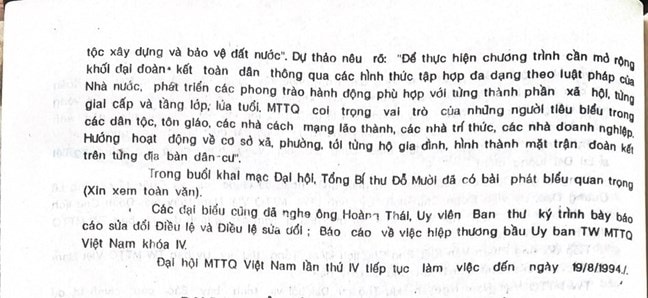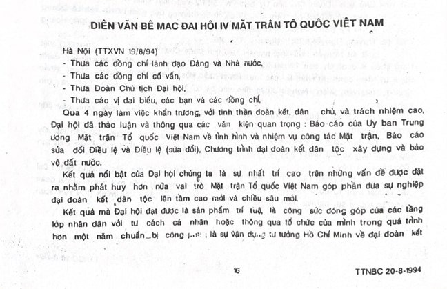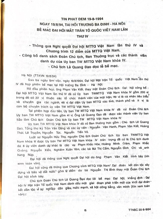 * Bài viết của Thông tấn xã Việt Nam số (231-TTX), ngày 20/08/1994 về Phiên Bế mạc Đại hội Mặt trận Tổ quốc Việt Nam lần thứ IV