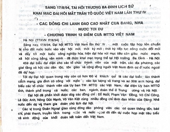 * Bài viết của Thông tấn xã Việt Nam (số 229-TTX), ngày 18/08/1994 về Phiên Khai mạc Đại hội Mặt trận Tổ quốc Việt Nam lần thứ IV