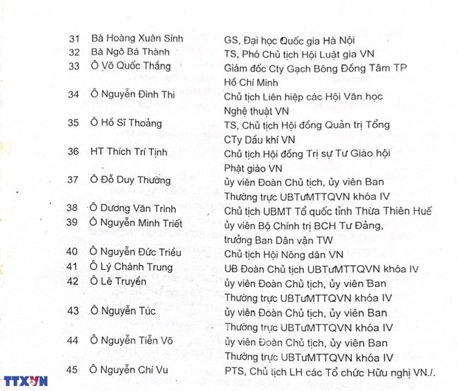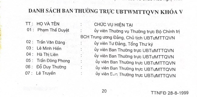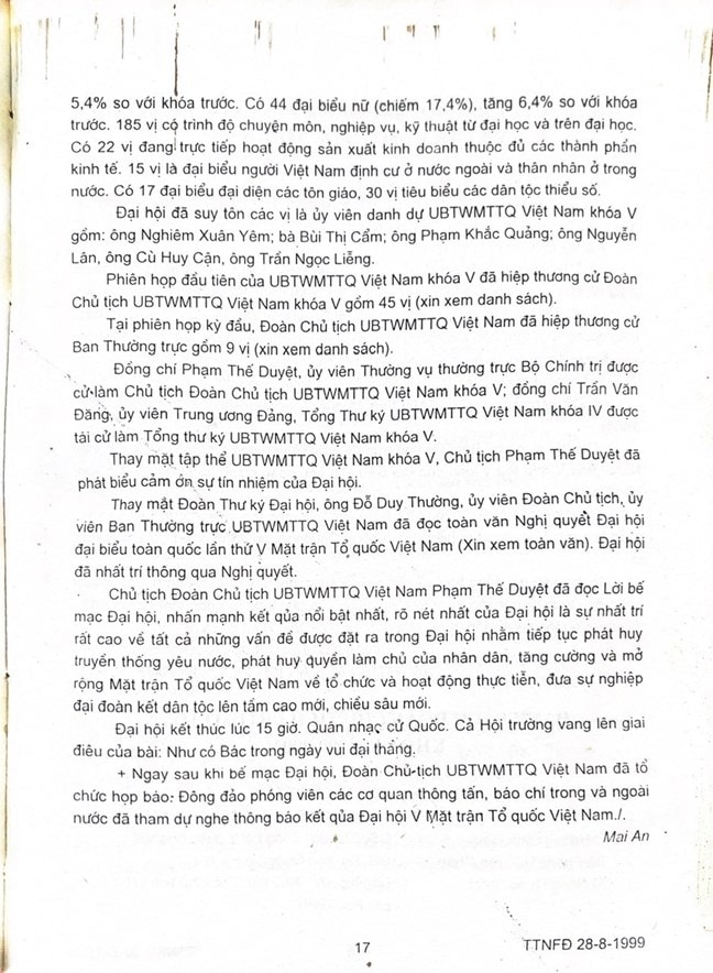 * Bài viết của Thông tấn xã Việt Nam (số 240 - TTX), ngày 28/08/1999 về Danh sách Ban Thường trực Ủy ban Trung ương Mặt trận Tổ quốc Việt Nam khóa V