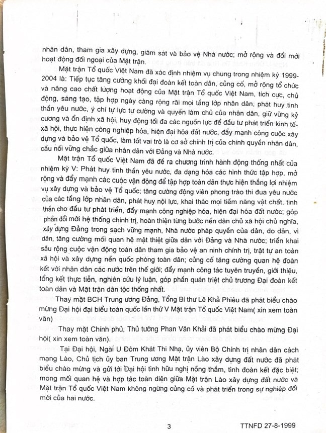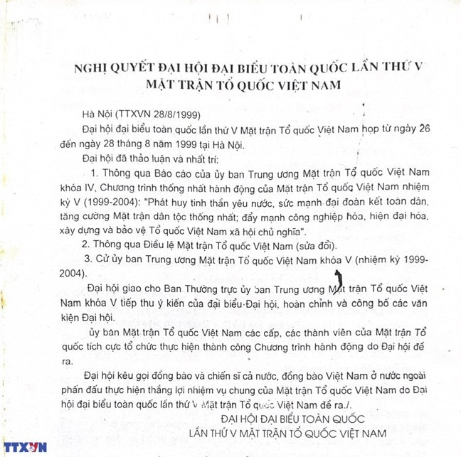 * Bài viết của Thông tấn xã Việt Nam (số 240-TTX), ngày 28/08/1999 về Nghị quyết Đại hội đại biểu toàn quốc lần thứ V Mặt trận Tổ quốc Việt Nam