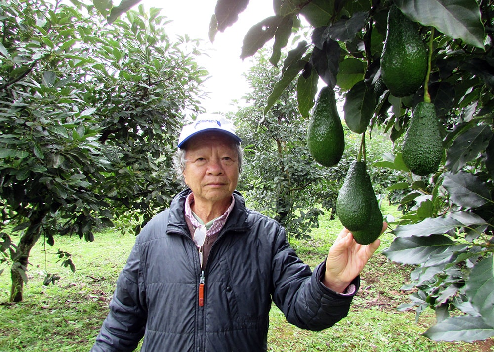 Ông Nguyễn Đức Thống trong Trang trại bơ Mỹ mang thương hiệu Tiến Đạt tại khu Đồi Tàu, xã Hòa Trung, Di Linh, tỉnh Lâm Đồng. Ảnh: V.V