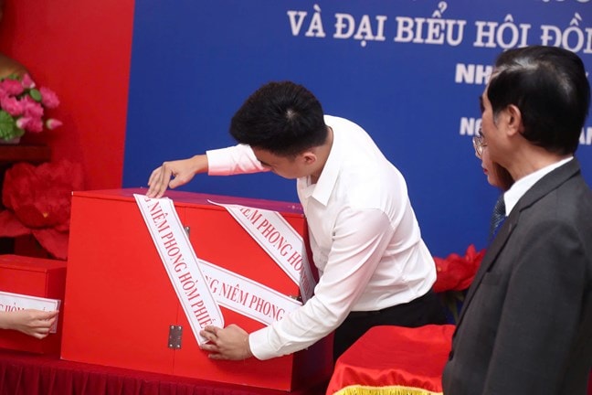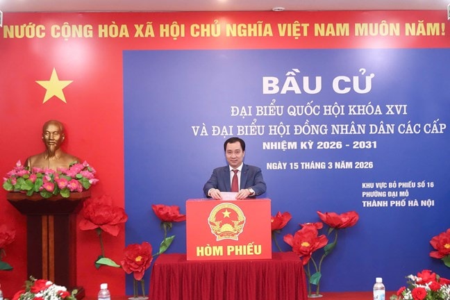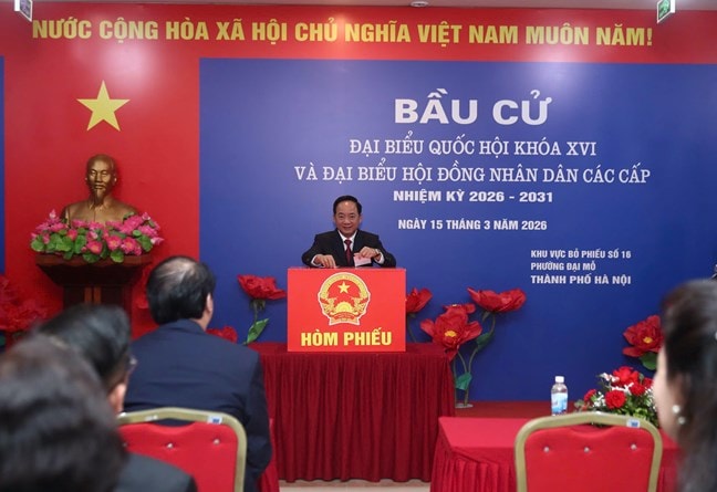 Ông Trịnh Văn Quyết, Ủy viên Bộ Chính trị, Bí thư Trung ương Đảng, Trưởng Ban Tuyên giáo và Dân vận Trung ương bỏ phiếu bầu cử tại phường Đại Mỗ (khu dân cư Vinhomes Green Bay Mễ Trì, Hà Nội).