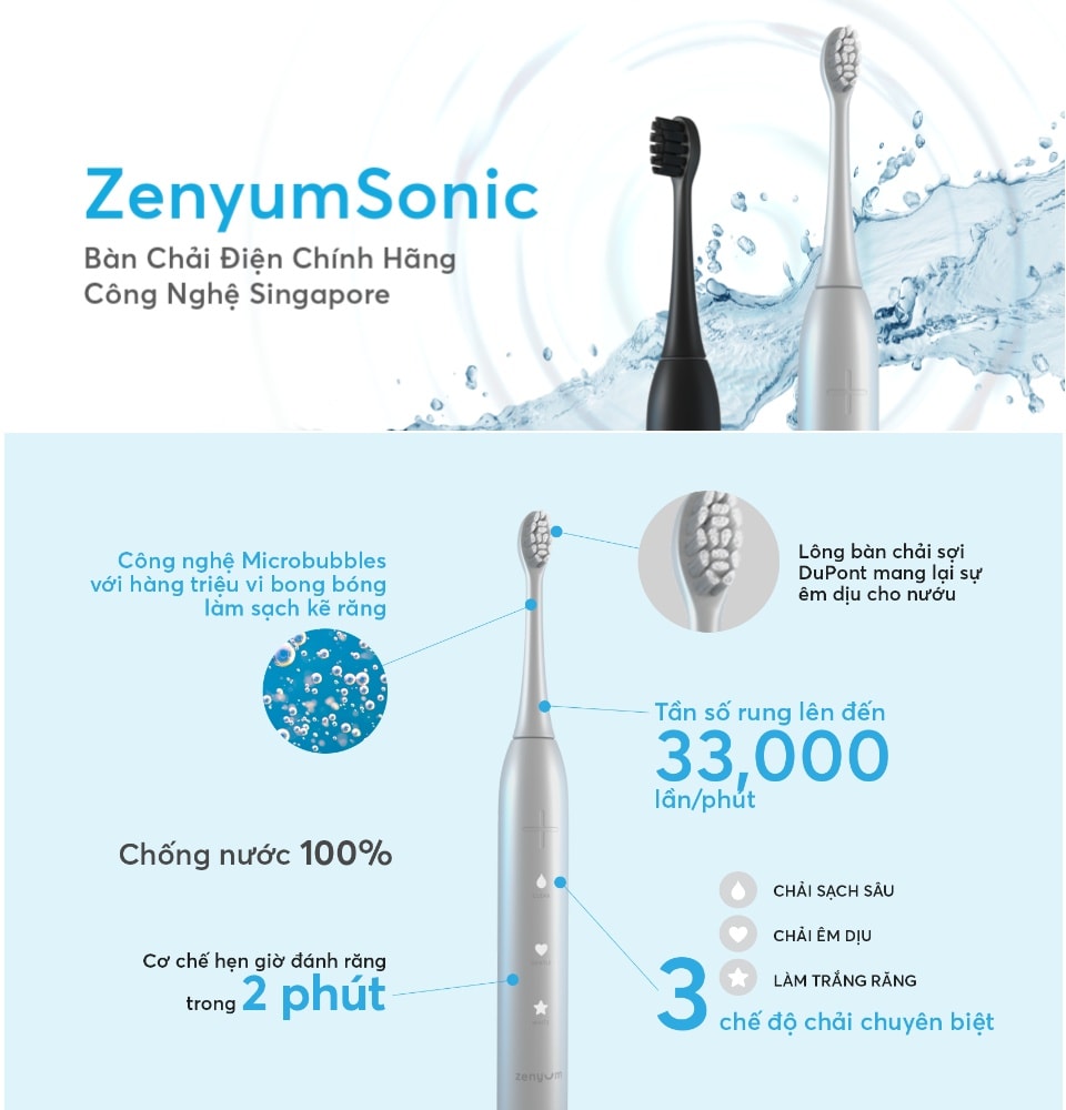 Ứng dụng công nghệ từ bàn chải điện Zenyum sở hữu tần số rung ấn tượng với 33.000 lần/phút, nhanh gấp 10 lần so với bàn chải điện thông thường, từ đó mang đến hiệu quả loại bỏ mảng bám lên đến 121% mà vẫn đảm bảo êm dịu cho nướu. Đặc biệt, Zenyum còn mang đến dịch vụ tiện lợi để người dùng dễ dàng đặt đầu bàn chải thay thế định kỳ 3 tháng một lần theo khuyến nghị của nha sĩ. Sản phẩm ZenyumSonic™ được bán với mức giá công bố 1.250.000 VNĐ.
